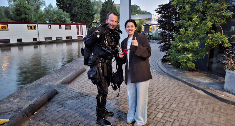 Marja ontlucht haar droogpak en trimvest en verdwijnt langzaam uit het zicht in het donkere water. Binnen een minuut krijg ik al een seintje: gevonden.
