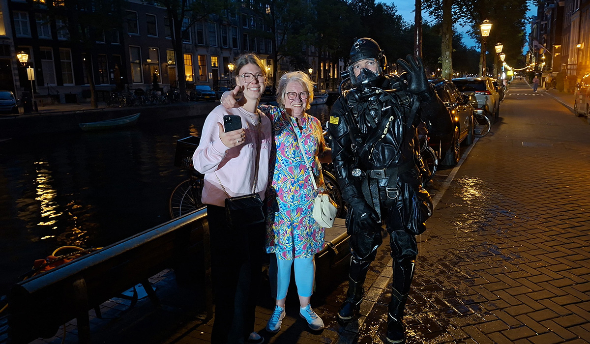 Marja is als eerste aanwezig en kijkt even rond, genietend van het uitzicht over de grachten. Al snel arriveert de rest van het team. We krijgen een exacte locatie van de telefoon en binnen de kortste keren staat alles klaar.