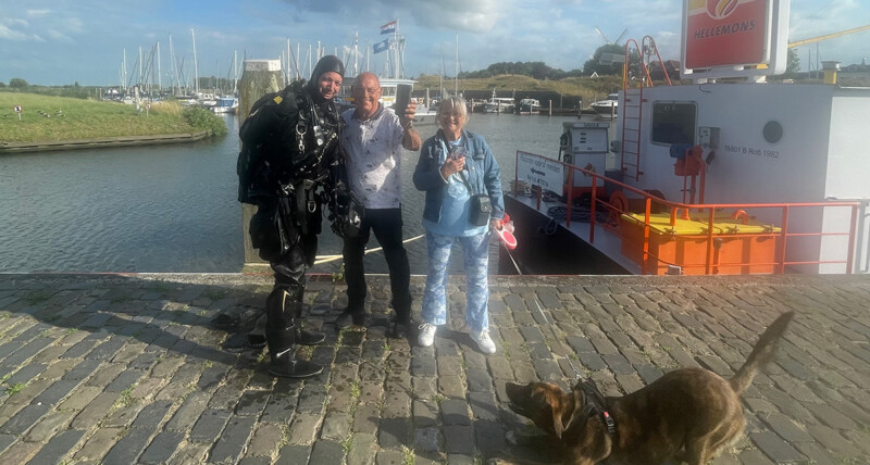 Een half uur later heb ik een kantwacht geregeld, een toestemming om te duiken en zitten we weer in de auto naar Amsterdam. We krijgen ondertussen nog wat foto’s van Willemijn van de situatie. Ze zijn zelf aan het zoeken met een schepnet. Daarmee kunnen ze de bodem verstoren, dus verzoeken we ze vriendelijk daar mee te stoppen.