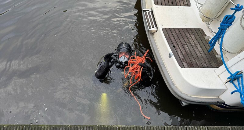 Ze trekt haar vinnen aan, zet de hoofdlamp aan en klikt de seinlijn vast. De metaaldetector stellen we in en niet veel later hangt Marja, drijvend op het lucht van haar trimvest in het midden van de vaart.
