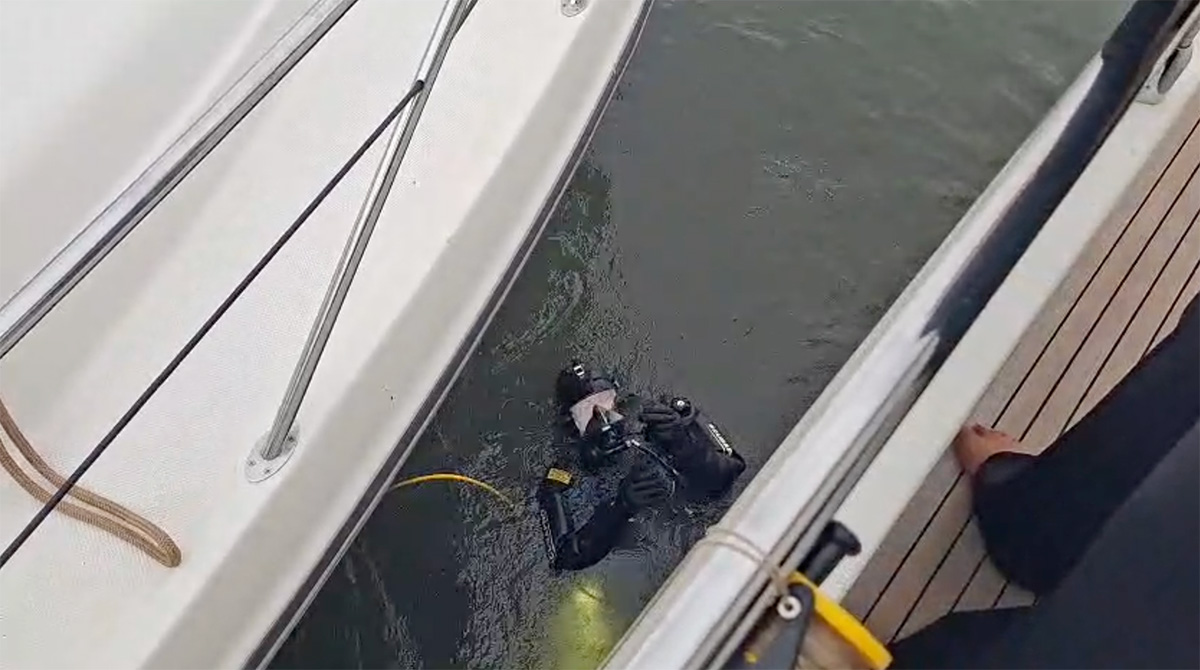 Na de laatste controles gaat Jochem te water. Bij de lijn wacht hij op de duikploegleider, bevestigt de communicatie en zakt af. Niet veel later komt hij boven. En ja hoor — mét telefoon! En nog werkend ook. De buurman is opgelucht en blij.