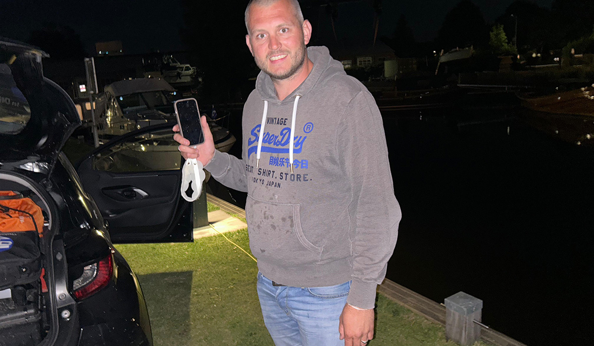 “We kwamen met de boot aanvaren, naar mijn idee iets te hard en ik wilde met gestrekt been de boot tegen houden bij de steiger, op dat moment verloor ik mijn telefoon uit mijn broekzak.”