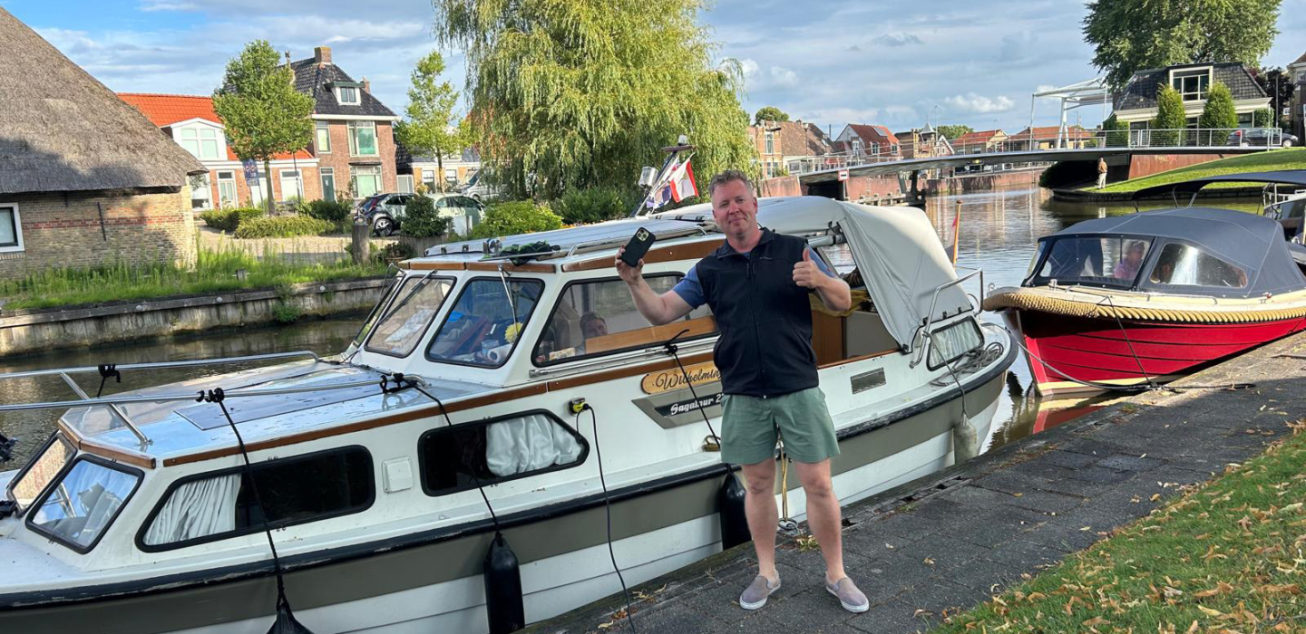 Milan was druk met bezig en met zijn vader aan het bellen toen hij zijn gloednieuwe iPhone 16 (vier dagen oud!) op het bootdak legde. Een paar klotsende golven later: plons, tussen boot en steiger. Milan sprong er achteraan, maar eindigde met een nat pak, een gescheurd trommelvlies en… geen telefoon. Gelukkig vond hij snel ons nummer en wisten wij binnen een half uurtje de Wijnhaven te bereiken.