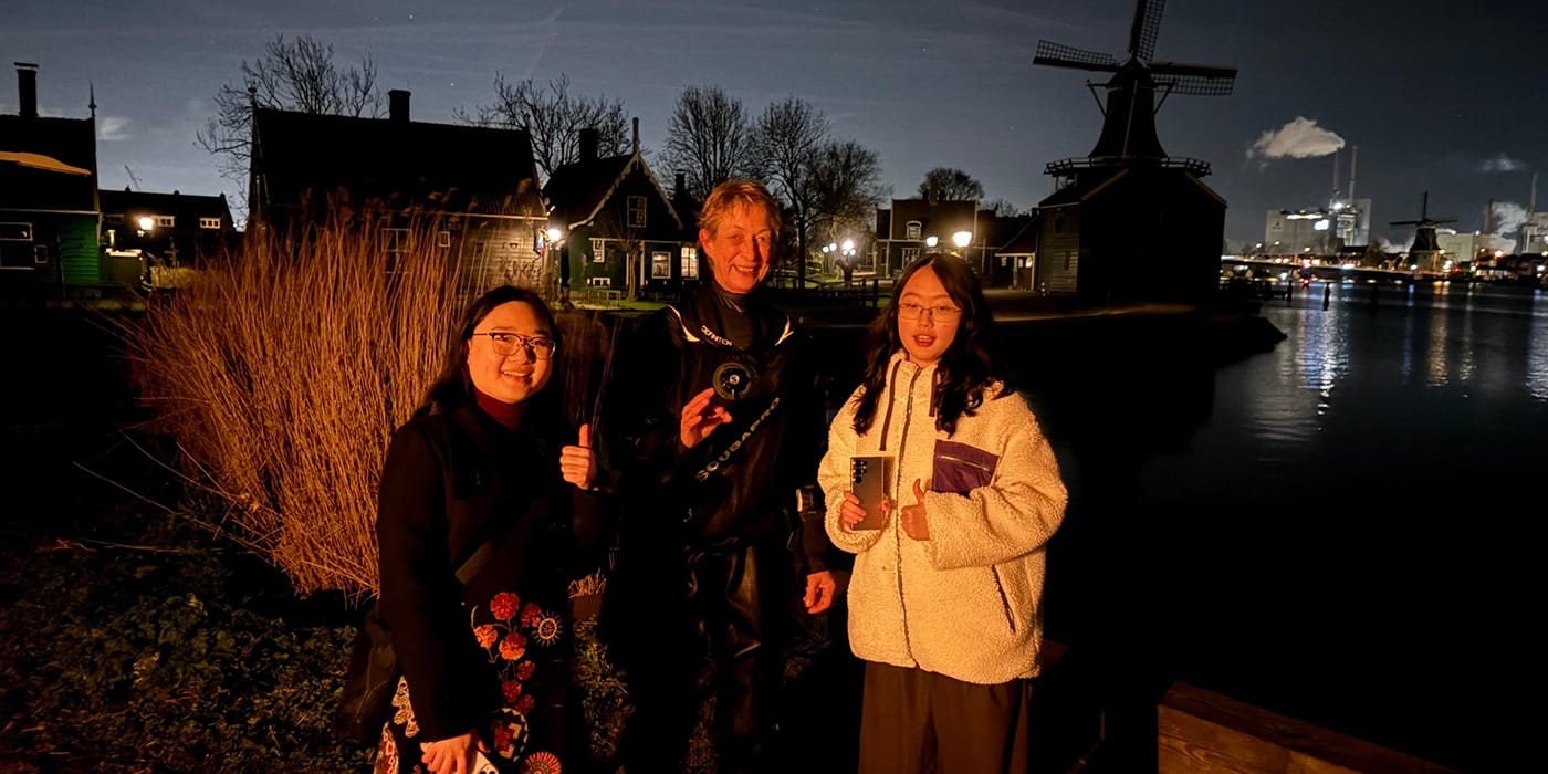 Op de Zaanse Schans werd een telefoon van twee studenten uit Singapore en Taiwan snel teruggevonden nadat hij tussen de steigerplanken in het water viel.