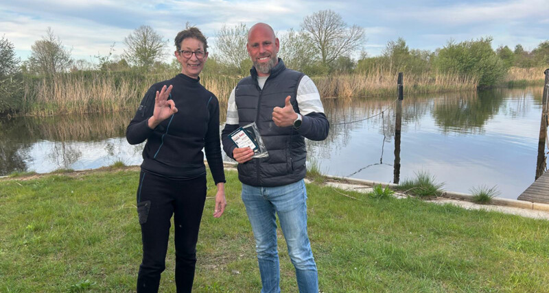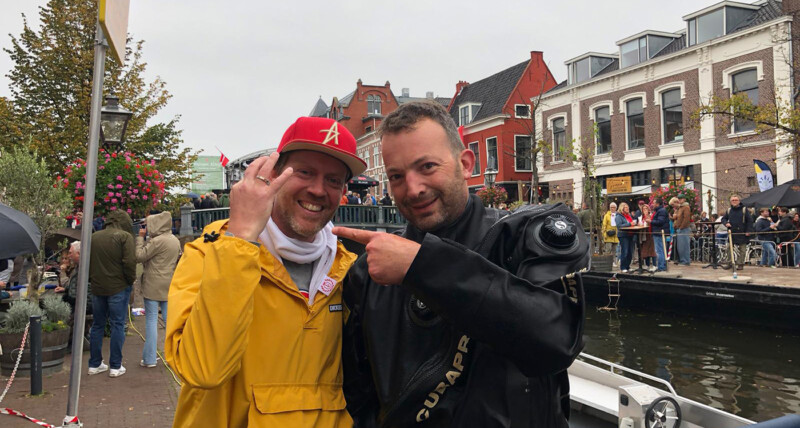 Vandaag mogen we duiken in Leiden bij restaurant De Stadthouder. Storm zat daar lekker op het terras toen zijn telefoon uit zijn broekzak viel. Precies tussen de terrasboot en de kade. Uiteraard schieten we te hulp.
