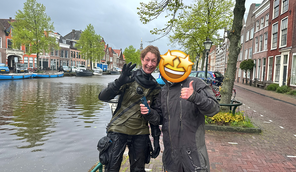 Eerste baantje op de nieuwe plek: niets. Tweede baantje: bingo, een mooi signaal op de metaaldetector: het hoesje met telefoon en de pasjes! Wat zijn Miranda en haar broer blij, haar vader is ons, later telefonisch ook enorm dankbaar. We krijgen, na het omkleden, een warme kop koffie, die smaakt extra goed en we kunnen meteen onze handen opwarmen!