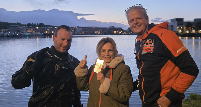 Het eerste baantje kom ik wat oud ijzer tegen, een blikje en een klein signaal dat ik negeer. Terug op mijn rug naar achteren en de 2de baan, halverwege, precies in het midden van de singel is het raak en heb ik de drone in mijn handen, een teken naar Marja, zodat ze kan filmen en dan kan ik Roland blij maken, hij heeft zijn dure DJI drone weer terug.