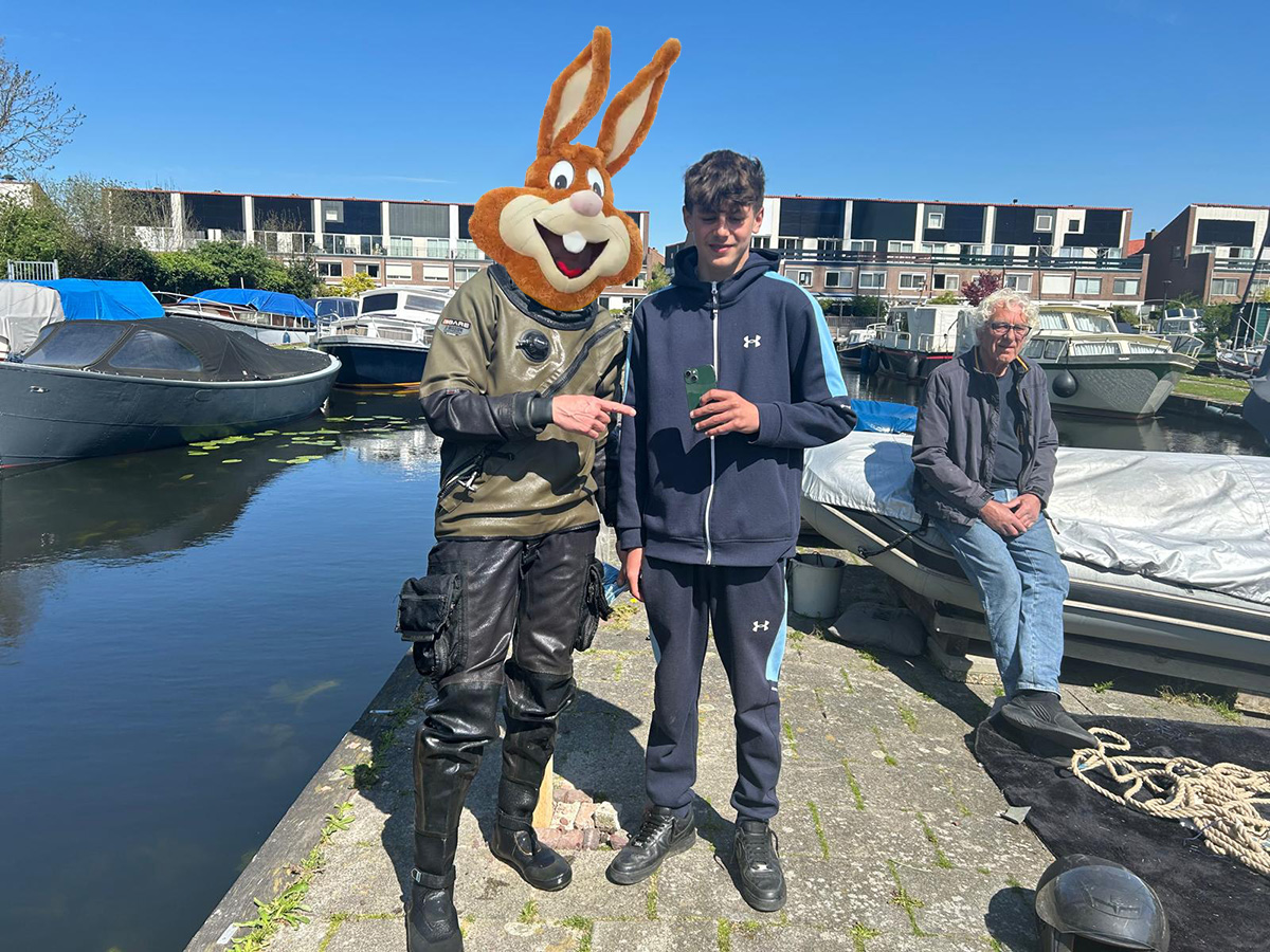 We mogen nu duiken naar zijn telefoon in de haven van watersport vereniging Leiden. Dit kleine haventje wordt in stand gehouden door de leden. Een mooie rustige plek, zomaar in Leiden.