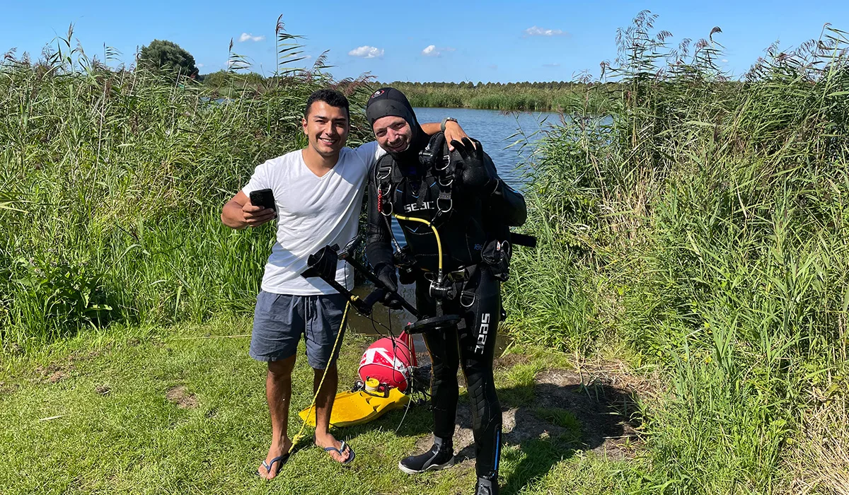 Ondertussen bekijken ze op de kant nog een keer goed naar de GPS lokatie. “Je moet nog iets meer naar rechts, voor jou naar links” roept Finn. En dan heb ik de telefoon, na een half uur duiken in mijn handen. Ik geef de kantwacht een seintje dat ik de telefoon heb en besluit terug te zwemmen naar de instap.