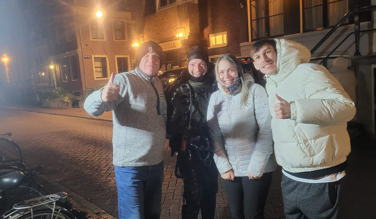 Sven stapt bij mij in de auto en we rijden naar Amsterdam. Recht voor Koninklijk Theater Carré duiken: dit is de eerste keer, ondanks alle gekke plekken waar we al gedoken hebben. Onderweg hebben we het vooral over duiken, een duikplan kunnen we nog niet maken, want we kennen de situatie nog niet.