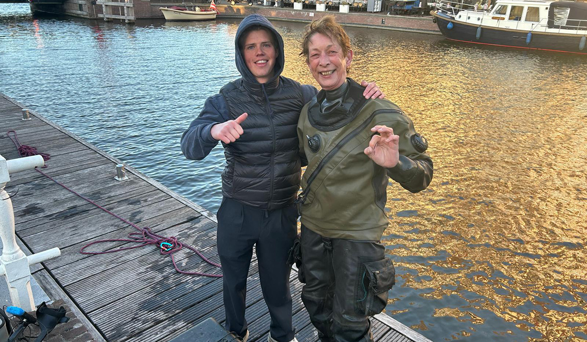 Langzaam loopt het lucht uit mijn pak en vest en zak ik naar de bodem van de haven, een meter of 3. Eenmaal op de bodem begin ik mijn zoektocht, er liggen grote stenen en rechts van mij een stalen damwand, dat is de reden dat ik het eerst even op de tast probeer. Een bierflesje, blikje en dan heb ik de telefoon al in mijn handen, onder water voel ik, want ik heb geen zicht: een kant glad, in een hoesje, meerdere camera’s en het formaat van een pro max, dit moet de telefoon zijn!