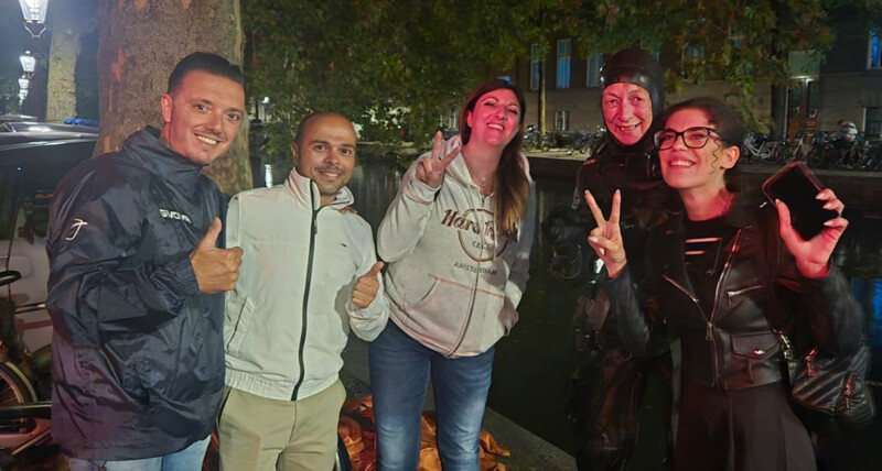 Met telefoon in de hand zwemt Marja naar de kant. Dankbaar wordt hij in ontvangst genomen. Onder het afbreken van het setje en uittrekken van pak maken we nog een praatje met de diverse buren. Wat een gezelligheid in Woerden. Dit was niet de eerste en zeker niet de laatste keer in Woerden.