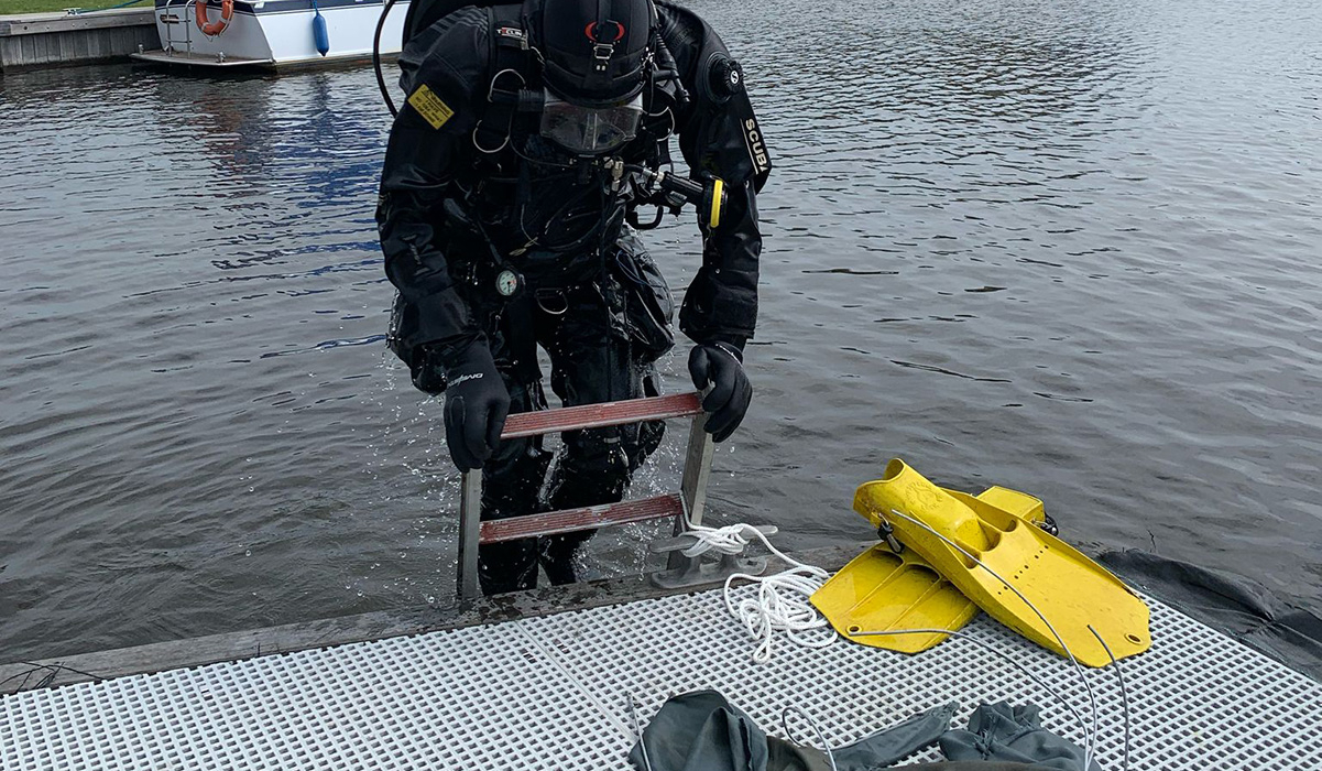 We belden even heen en weer en spraken af dat hij tijdens zijn reis een geschikte plek zou doorgeven. Onze enige voorwaarde: we moeten met de auto’s in de buurt kunnen komen. Ondertussen gingen wij alvast richting Lemmer, alsof we een verrassingsdate hadden met een schip. Halverwege kregen we de locatie door: tussen Wârd en Suwâld. Mooie omgeving, veel geschiedenis en water dat uitnodigt tot… nou ja, duiken.