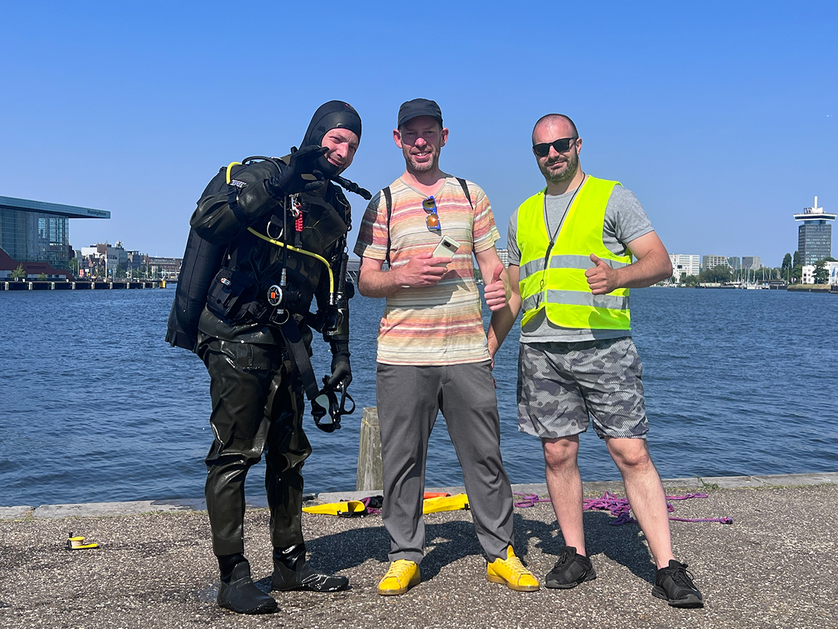 Vanochtend zitten we om half 9 in de auto naar Amsterdam, Tommy als kantwacht en ik ga de telefoon opduiken. We weten nu al dat dit een heftige duik gaat worden. We hebben geen zicht en het is er, afhankelijk van welke waterkaart je gebruikt, tussen de 10 en 14 meter diep!