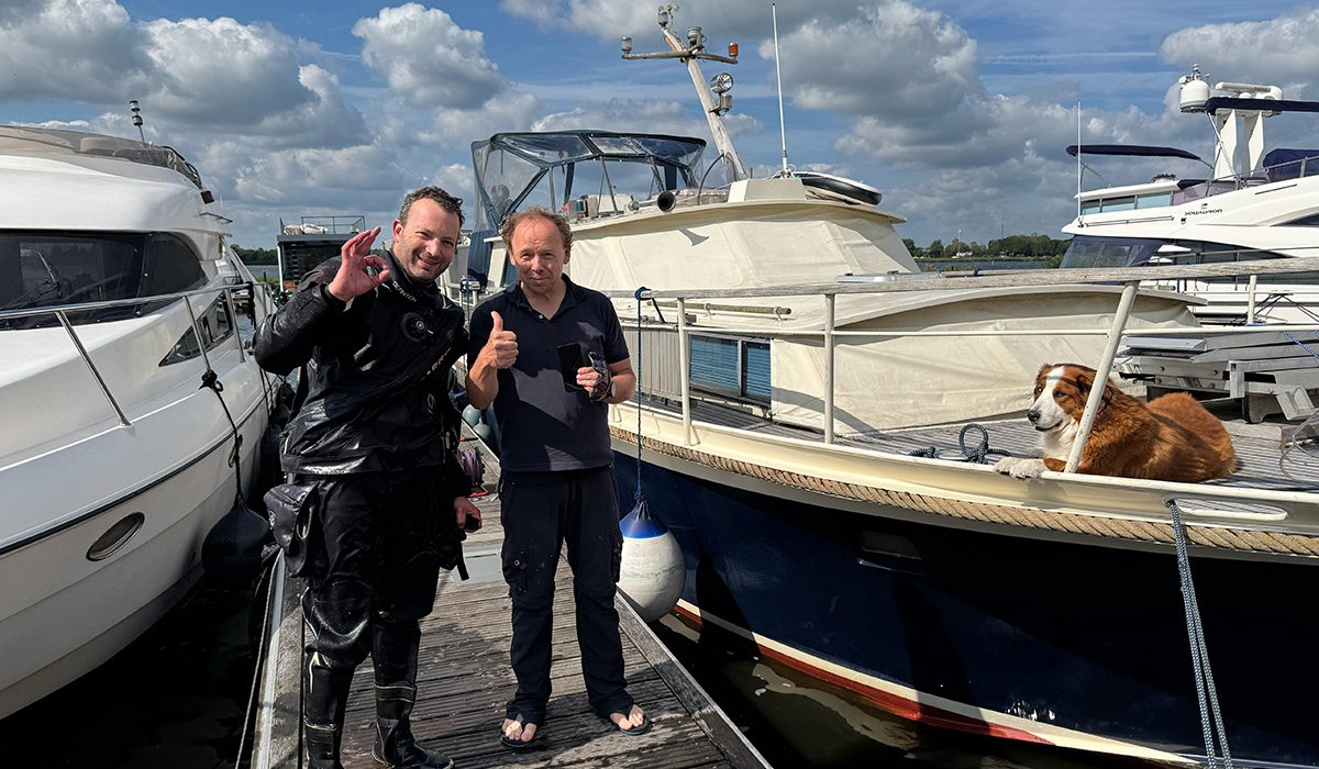 Jochem trekt zijn droogpak aan, pakt de metaaldetector en stapt het water in. Eerst checkt hij de plek die Sandra aanwees. Geen iPhone. Dan maar onder de kade kijken – want na dat ‘stokprik-offensief’ kan alles verplaatst zijn. En jawel hoor… daar ligt ‘ie!