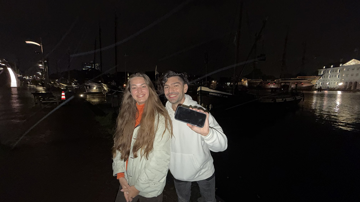 Jochem komt boven met een brede glimlach — en een iPhone in zijn hand. Anna juicht, haar reis door Amsterdam is officieel gered. We maken nog snel een foto als aandenken, wisselen wat lachende woorden uit en nemen afscheid.