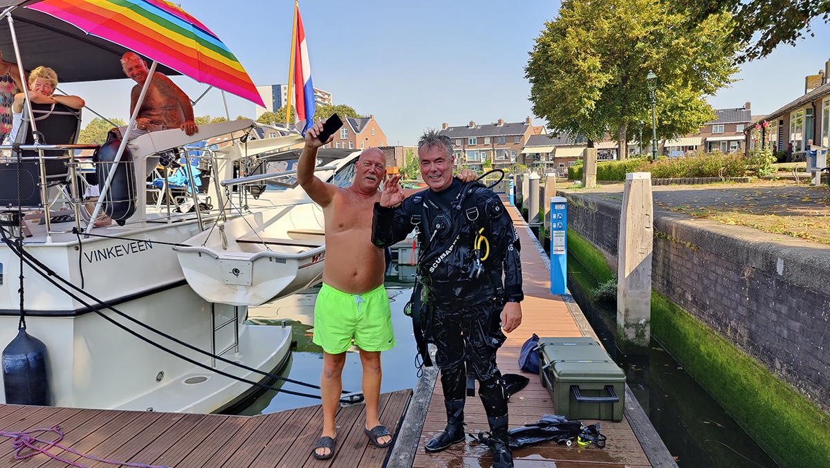 Snel schakelen — het team overlegt: misschien is de telefoon wegglijden, iets verder onder de boot of juist langs de kademuur verdwenen. We schuiven de zoeklijn anderhalve meter op en de duiker zoekt de zone naast de holle kademuur na. En dan: hebbes — precies daar, in een beschutte holte tussen hout en modder, ligt de telefoon.