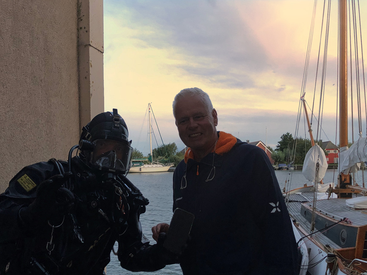 Soms verwachten mensen een duiker in een wetsuit en met snorkelmasker, maar dat mag niet van de wet. Dus: droogpak aan, volgelaatsmasker, duikset opbouwen, communicatielijnen uitleggen – alsof we een kleine operatie draaien. Iedereen in het team weet precies zijn rol.