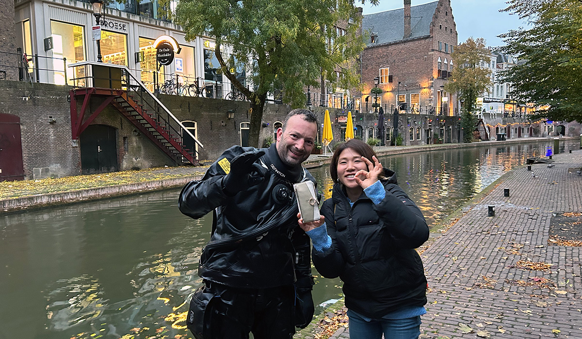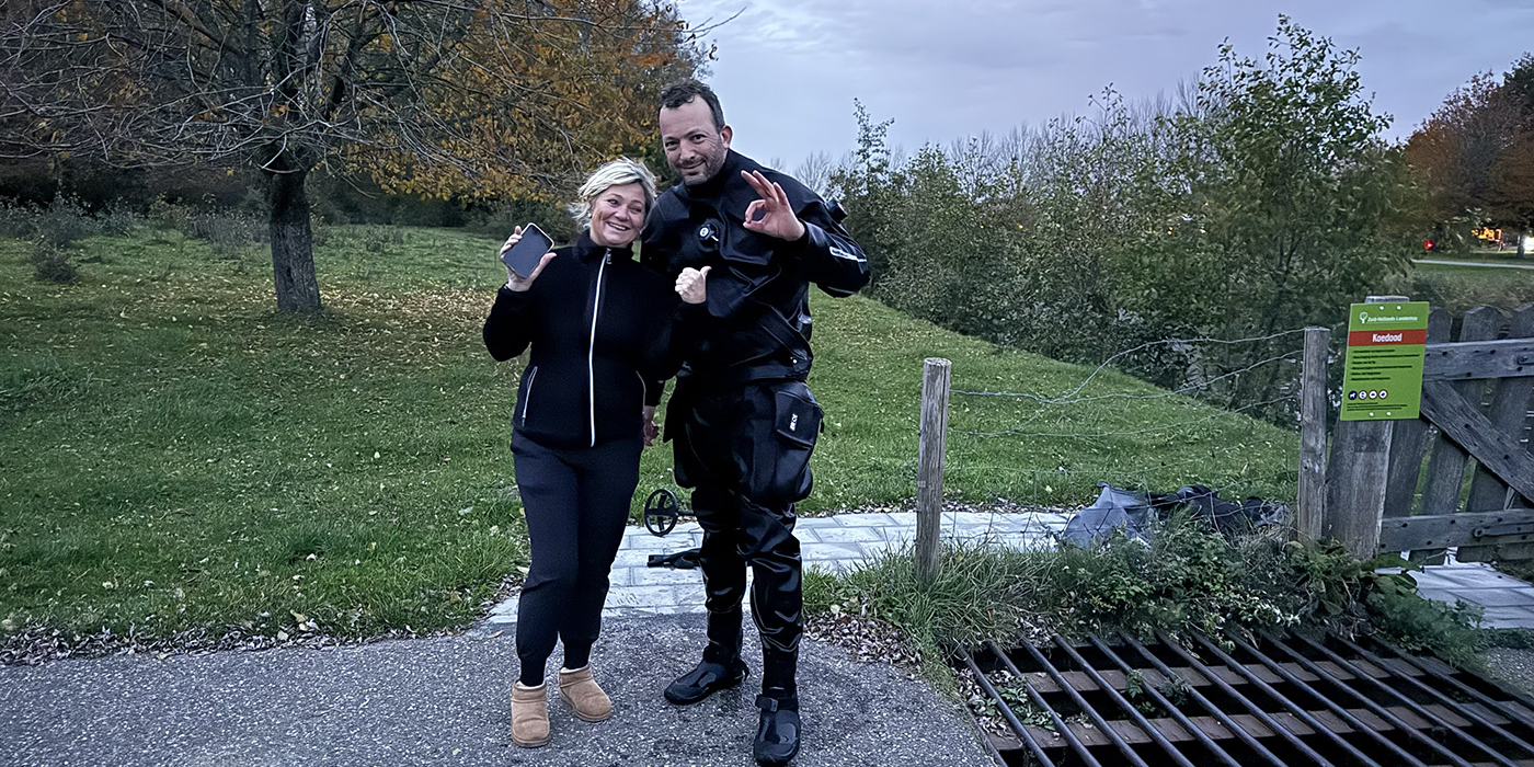 Niet veel later lig ik, met een commandosprong, in het water. We koppelen de seinlijn en Marja geeft mij de metaaldetector aan. Ik daal af. Op de meest logische plek ligt geen telefoon. Dan een mooi signaal: een blikje, een andere tripod en en nog een blikje.