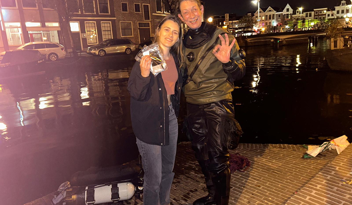 Na wat onrustig drentelen van de groep is het tijd om te duiken. Gelukkig duurt de zoektocht niet lang: binnen vijf minuten staat Marja alweer op de kade, mét telefoon in de hand. Een klein wonder voor de italianen, want in de donkere grachten van Amsterdam kan zo’n toestel makkelijk voorgoed verdwijnen.