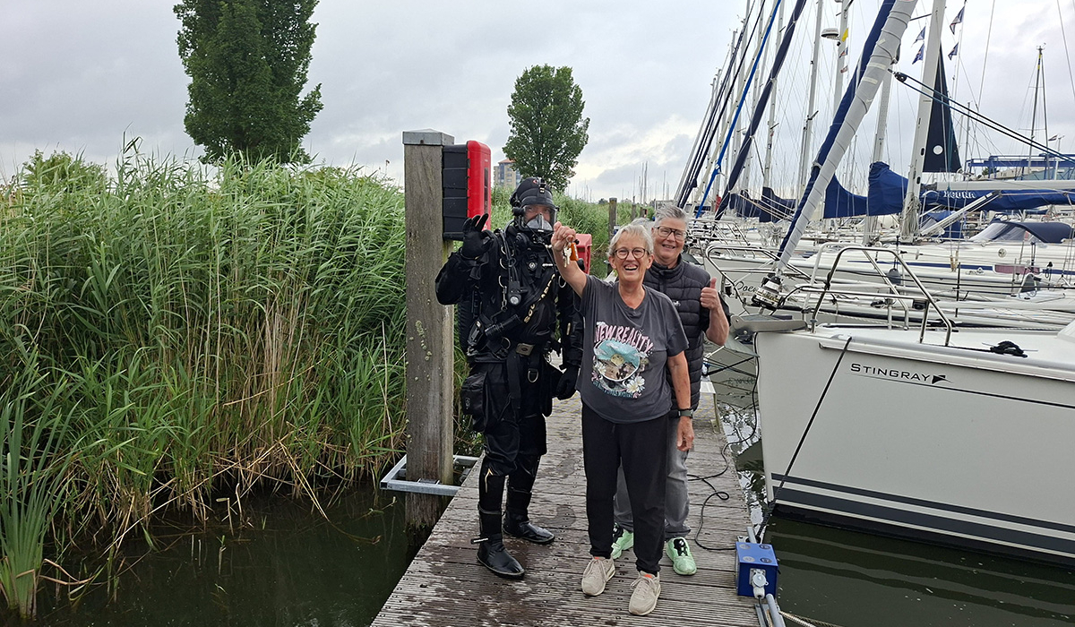 We worden gebeld door Jacqueline. Haar vriendin Elly is bij het instappen op haar zeilboot in de Houtribhaven in Lelystad haar sleutelbos verloren. Glip! Recht uit het open zijvakje van haar tas, zo het water in. Oeps.