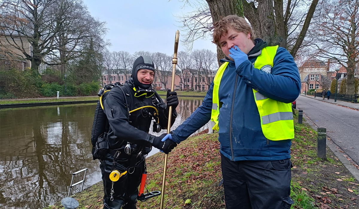 Ja hoor, daar ligt hij, de staf van Sinterklaas, verloren gewaand, eenzaam op de bodem, dit is toch wel wat makkelijker dan een gouden ring opsporen!