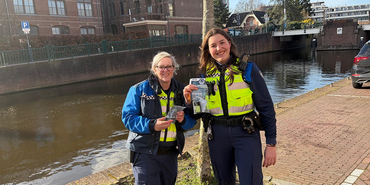 In Leiden werd bij jachthaven Zijlzicht een telefoon en pasjeshouder na een modderige zoektocht vanaf de steiger succesvol teruggevonden.