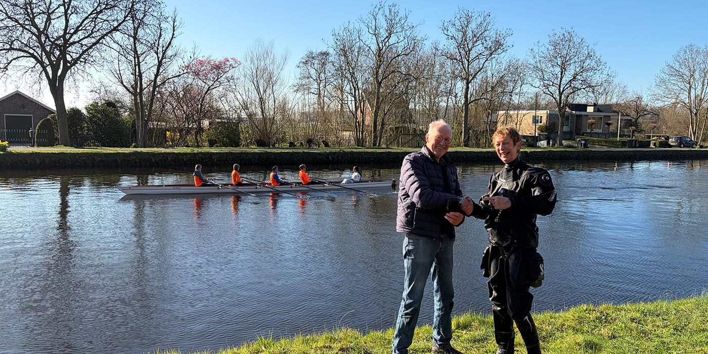 Langs het Delftse Jaagpad doken we de telefoon van Barend op nadat deze tijdens het coachen van roeiers in het water was gevallen.