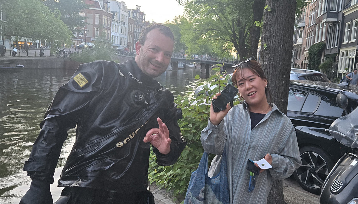 Dit keer heeft Danny onze hulp nodig. De telefoon van een Japanse familie ligt in het water. Danny is al een tijd bezig geweest, maar door het weinige metaal in de telefoon valt hij elke keer van de magneet. Uiteraard gaan we Danny en de familie helpen. We hebben eerst een andere duik in Amsterdam en rijden dan met het hele team door naar het centrum.
