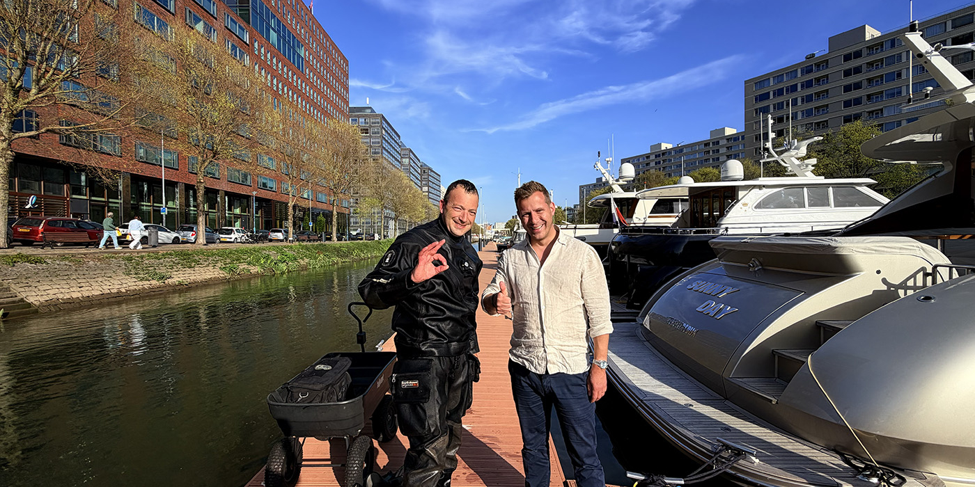 Het zonnetje schijnt fel boven Rotterdam, de stad die al sinds de zestiende eeuw nauw verbonden is met het water, terwijl we aankomen bij Jachthaven de Rotterdamsche Admiraliteit. Voor ons is dit bekend terrein, want we hebben hier al vaker in de troebele diepten gekeken, deze verhalen over eerdere duikavonturen kun je hier op onze website teruglezen. Vandaag zijn we hier voor Jeroen, die zijn dag waarschijnlijk heel anders had voorgesteld.