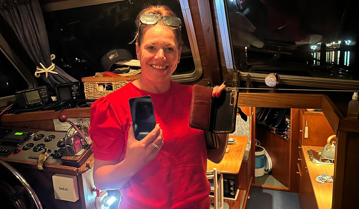 We maken dankbaar gebruik van de steiger van Flagship Amsterdam Canal Cruise. Terwijl we ons voorbereiden, komt er een groep Turkse dames aan. Ze praten door elkaar, giechelen en het duurt even voordat we weten wie de ongelukkige eigenaar is. Maar als we haar hebben gevonden, wijst ze glashelder aan waar de telefoon ligt.
