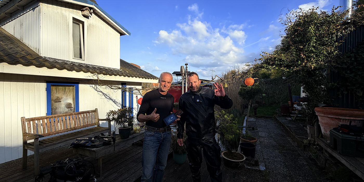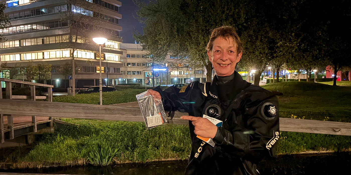 Nadat we weer op de kant staan, vragen we of broer en zus misschien samen met de gevonden telefoon op de foto willen voor ons archief. Ze laten echter een beetje verlegen weten: “liever niet” Dat respecteren we natuurlijk direct, want niet iedereen vindt het prettig om met hun hoofd op internet te staan. Ze vonden het echter wel heel leuk dat er een verhaaltje over hun avontuur op de site zou komen te staan, dus daarom hebben we dit keer een foto geplaatst waar alleen onze duiker op te zien is. Met een goed gevoel en een gevonden telefoon sluiten we deze geslaagde actie in Delft af en vertrekken we weer naar de volgende klus.
