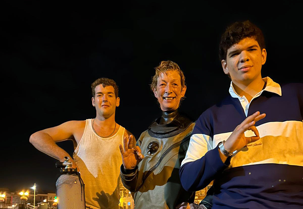 De opluchting is groot en de sfeer zit er meteen goed in. We drinken nog een gezellig drankje mee, wisselen sterke verhalen uit en maken een foto om dit avontuur vast te leggen. Een typisch Leids nachtverhaal: midden in de stad, midden in de gracht, maar vooral midden in de nacht. Tijd om ons masker te verruilen voor een kussen – het was weer een dag vol duiken, verhalen en bijzondere ontmoetingen.