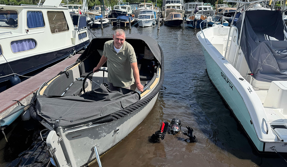 De situatie is snel duidelijk: er is inderdaad zicht onder water, dus Jochem neemt zijn onderwatercamera mee. Binnen no-time ligt hij in het water en ziet hij het probleem – een touw met dubbele lus om een schroefblad. Met één hand puzzelt hij het touw los, terwijl hij met de andere hand filmt. Dat levert leuke beelden op voor onze volgers – eens wat anders dan een standaard bovenwater-shot.