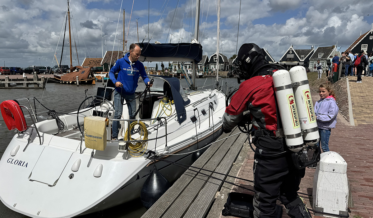 De KNRM sleept het gezin veilig naar de haven van Marken, een voormalig eiland dat dankzij de dijk (1957) nu vastzit aan het vaste land. Marken staat bekend om zijn houten huizen op palen, kleurrijke klederdracht en – nu dus ook – als werkgebied van Recovery Divers.