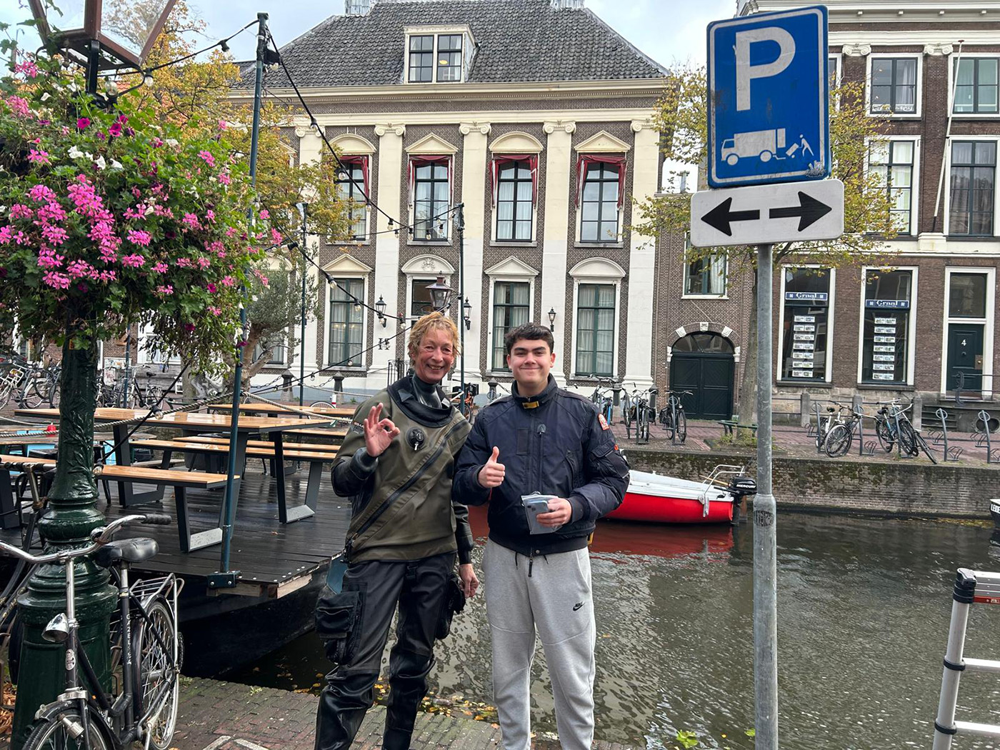 Diezelfde dag duiken is geen optie — het is feestweek en de stad is overdag te vol voor veilige inzet met al onze spullen (een van onze recente Leidse verhalen lees je hier: https://recoverydivers.nl/gouden-trouwring-teruggevonden-in-leiden/). Dus spreken we af voor de volgende ochtend en zijn precies op tijd. Vader en zoon wijzen ons de plek; omdat het zo’n gezellige avond was, weet de jongen zelf niet precies of hij de telefoon in zijn hand had toen hij in het water viel — het blijft een beetje mysterieus.