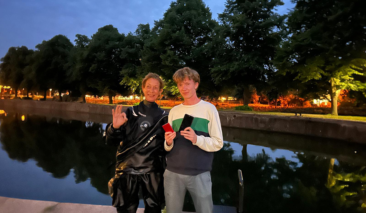 Aan de Singel haalden we de gevallen telefoon van Muriels zoon binnen vijf minuten uit het water terug, nog werkend én met een grote glimlach.