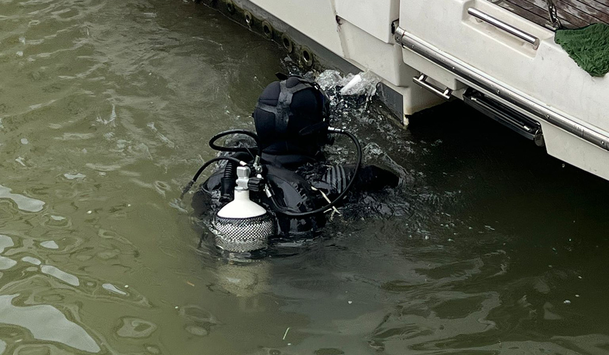 Na koffie, uitleg en een duikplan ging Jochem te water via de trailerhelling. Het zicht was beperkt, maar de algengroei duidelijk zicht- en voelbaar. Pascal merkte al dat de boot snelheid miste, ondanks het gigantische vermogen.