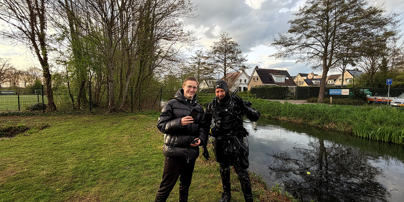 De opluchting is groot bij Vico als we de modderige maar intacte iPhone omhoog houden. Ook deze iPhone staat nog aan. Nadat de duiker uit het slootje is gegaan, begint het team met afbouwen van de apparatuur. We bergen de slangen, de detector en de duikuitrusting weer netjes op in onze auto terwijl de zon langzaam zakt boven het Utrechtse landschap. Wij geven Vico de drooginstructies mee zodat zijn iPhone het ook blijft doen, want water en elektronica blijven een lastige combinatie, zeker in de mineraalrijke wateren van de polder. Met een tevreden gevoel en een succesverhaal rijker nemen we afscheid van de dankbare visser, wij vervolgen onze weg naar de laatste duik van de dag.